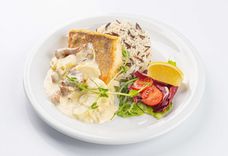 358 г • Филе судака, лисички, лук, яблоки свежие, тимьян, вино белое, масло сливочное, сливки 33%, рис-микс отварной с маслом зеленым