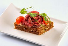48 г • Хлеб чёрный, ростбиф из говядины, томат черри, соус тар-тар, кресс-салат