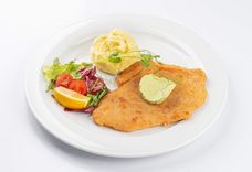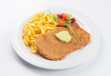 330 г • Вырезка свиная, яйцо куриное, мука пшеничная, сухари панировочные, картофель фри, масло зеленое, томат черри, микс-салат, лимон