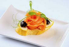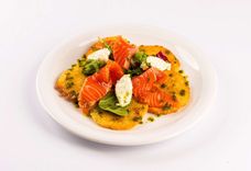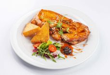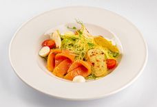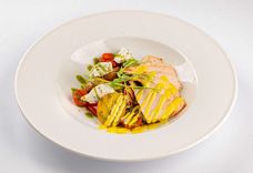 223 г • Сёмга гриль, микс-салат, томат черри, лимон, соус Бальзамик, кресс-салат