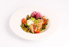 227 г • Филе тунца, фасоль стручковая, томаты свежие, микс-салат, яйцо куриное, лук красный, чеснок, кунжут, масло оливковое, уксус винный, соус соевый, майоран