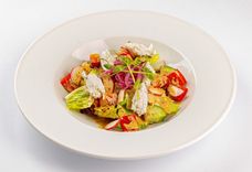 240 г • Сёмга слабосолёная, салат Ромэн, томаты черри, яйцо перепелиное, сыр Джюгас, соус Цезарь, чесночные гренки