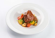 Томлёные говяжьи щёчки с черри-картофелем и овощами