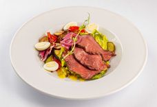 220 г • Запечённая говядина, микс-салат, овощи гриль, огурцы маринованные, соус медово-горчичный, лук репчатый, яйцо перепелиное