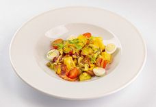 268 г • Картофель, копченая колбаска, грудинка, огурцы маринованные, томаты черри, лук красный, яйцо перепелиное, каперсы, мёд, горчица французская, кресс-салат
