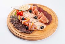 313 г • Бастурма, ветчина, полендвица, руляда из птицы, говядина сыровяленая, вяленый окорок, грудинка, томат черри, огурцы маринованные, лук красный, маслины, хрен