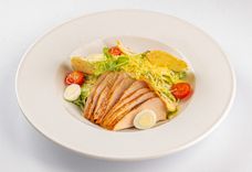 280 г • Филе индейки, салат Ромэн, томаты черри, яйцо перепелиное, сыр Джюгас, соус Цезарь, чесночные гренки